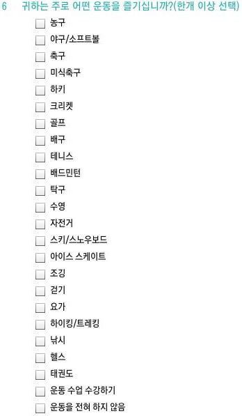6. 귀하는 주로 어떤 운동을 즐기십니까? (한 개 이상 선택)